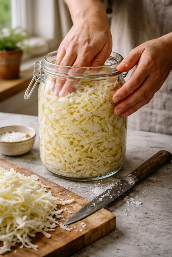 Tip: Proef je zuurkool elke paar dagen. Na 1 tot 2 weken is hij mild en knapperig; na 3 tot 4 weken intenser en zuurder. Zet hem in de koelkast zodra de smaak precies goed is naar jouw smaak. Daarna blijft hij maanden houdbaar.